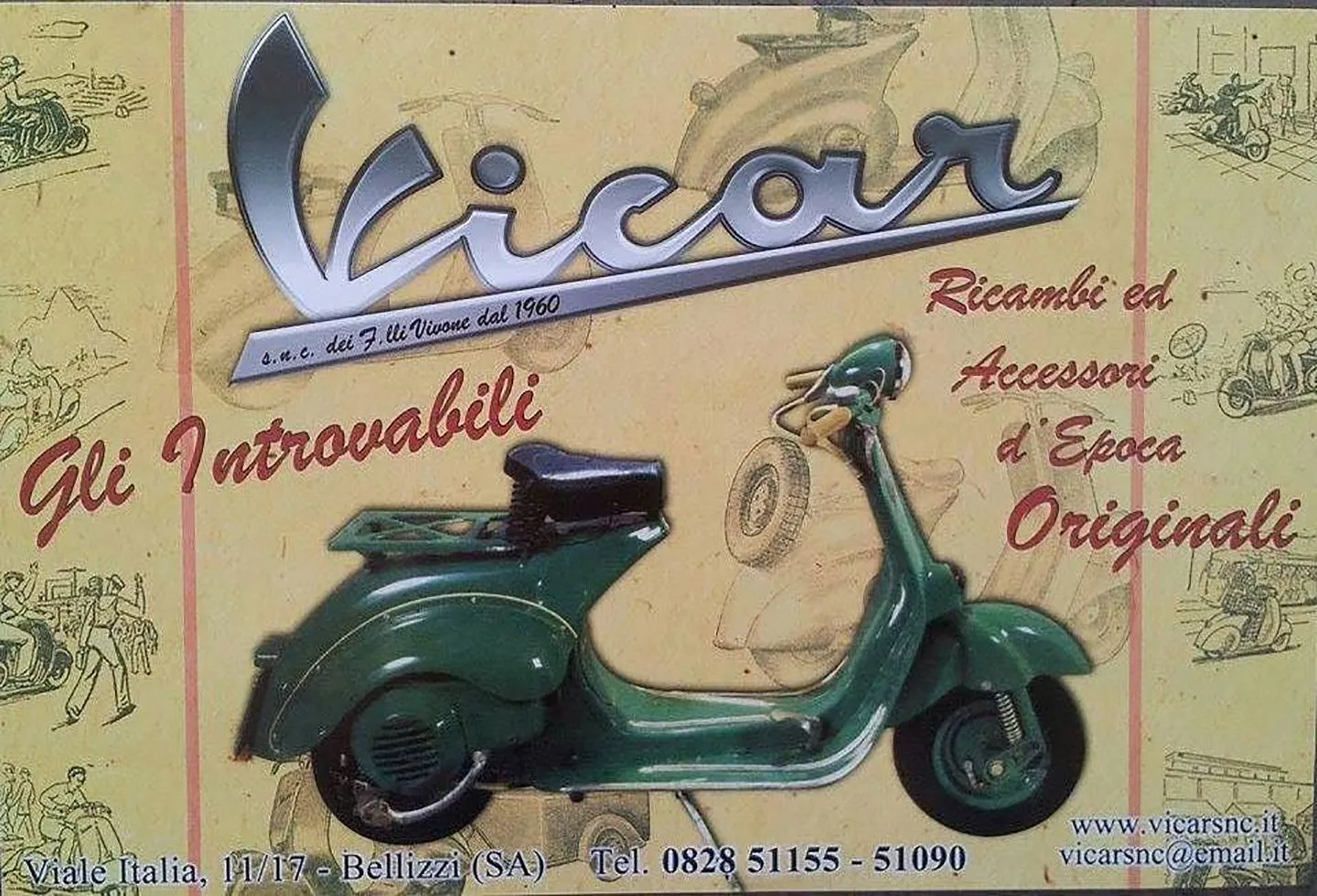 Da noi potrete trovare un ampio ventaglio di scelta di ricambi Piaggio per scooter e Vespe d’epoca, inoltre troverete tutti i ricambi per Motocarri Piaggio Ape , Porter,microvetture, nonché una grande varietà di ricambi e accessori per camper e caravan. Da più di cinquant’anni l’azienda con sede a Bellizzi (Sa) porta avanti un impegno fatto di passione e professionalità : nata come officina e in seguito specializzata nella rivendita di ricambi, la Vi.Ca.r è diventata prima concessionaria Innocenti e quindi, negli anni Settanta, punto di riferimento per tutti le officine e ricambisti Piaggio. Per questo negli oltre mille metri quadrati troverete le officine, gestite da uno staff preparato e disponibile in grado anche di compiere rettifiche motori, un ampio magazzino ricambi, con una speciale vocazione per i ricambi Vespa Vintage e una grande area espositiva.